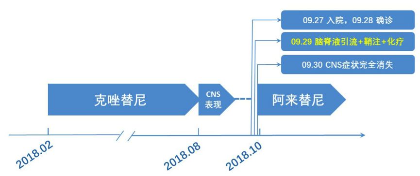 2018年9月29日,患者病情出现恶化,出现头痛伴短暂性意识障碍,查体双侧瞳孔等大等圆,对光反射灵敏,心率45次/分,血压160/100mmHg,考虑颅内高压导致出现Cushing反应。立即予以镇静、脱水等对症处理,并紧急腰穿行脑脊液引流,同时鞘内注射培美曲塞化疗联合全身培美曲塞单药化疗。患者于2018年9月30日恢复意识,并能交流顺畅,活动自如。同日,患者开始口服靶向阿来替尼二线治疗,并于10月2日因头痛再次腔内注射培美曲塞单药化疗。后患者肺部和中枢神经系统控制可,患者PS评分恢复0分。从治疗的结局来看,该病例算是一例非常成功的脑膜转移治疗成功的病例。