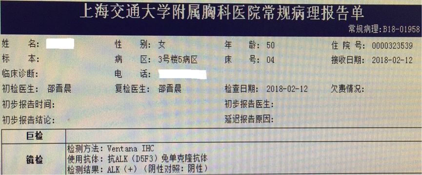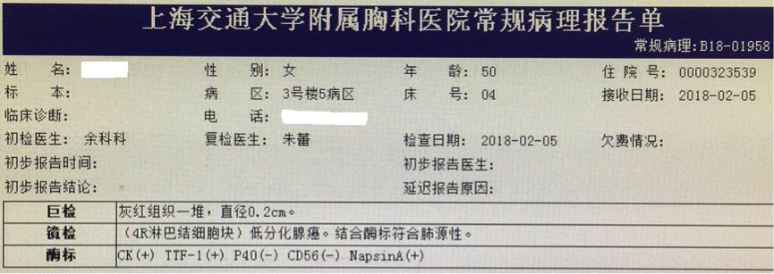 患者于2018年2月5日行EBUS检查,活检病理提示:4R淋巴结细胞块低分化腺癌,基因检测提示:ALK(ventana IHC)(+)、EGFR(-)、ROS1(-)。诊断考虑左肺腺癌 cT2N2M1b(双肺、单发骨) IVA期,ALK阳性。