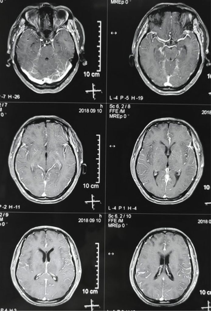 患者于2018年9月初开始出现间断头疼、失语、反应迟钝,并进行性加重,但头颅MRI(2018.09.10)脑实质未见明显转移,予以对症支持治疗。