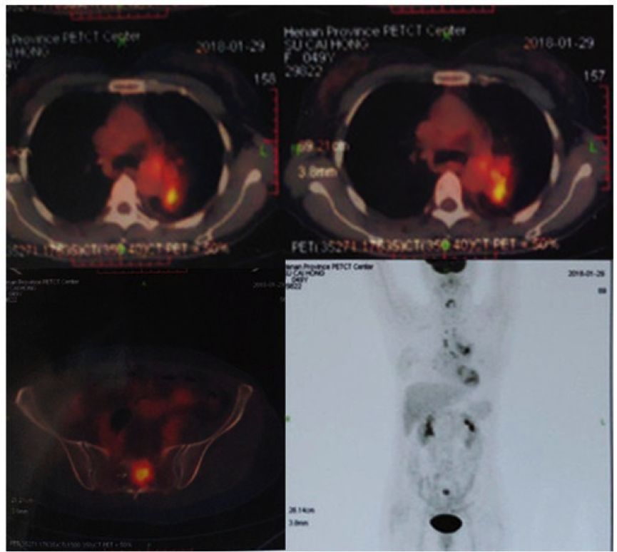 近日,郑州大学附属第一医院肿瘤科李醒亚教授团队分享了一例ALK+脑膜转移肺腺癌患者诊疗的临床常见经典病例,并对临床脑膜转移的诊断和治疗提出了自己的思考。该患者为49岁、非吸烟、女性患者,因“干咳1月”于2018年1月就诊于上海交通大学附属胸科医院,PET/CT检查提示左肺近肺门处软组织肿块影伴局部代谢活跃,大小约45mm*18mm,SUVmax7.2,双肺弥漫结节影,代谢增高,双肺转移可能性大,左侧胸腔可见少量胸腔积液;2L、4L、7组淋巴结肿大,最大淋巴结位于4L组,大小约22*16mm,SUVmax 4.9;骶骨骨质破坏伴局部代谢活跃。头颅增强MRI检查未见明显转移征象。诊断考虑左肺中央型肺癌伴单发骶骨转移可能。