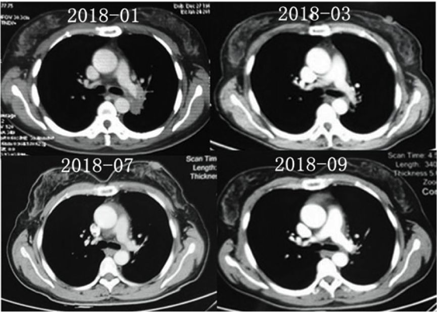 图4.患者接受克唑替尼治疗时候的基线情况(2018-01)、以及治疗随访胸部CT影像
