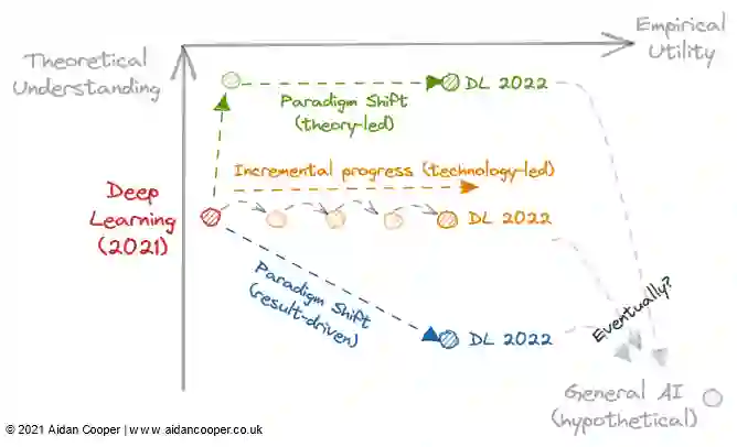 由于由于技术的飞跃,一些领域看到了科学进步的阶梯式变化。* 深度学习 * 领域并没有被它的理论基础所解开,这些基础是在 2010 年代深度学习热潮之前 20 多年发现的——它是由消费级 GPU 支持的并行处理推动了它的复兴。技术飞跃通常表现为沿经验效用轴向右跳跃。然而,并非所有以技术为主导的进步都是飞跃。今天的深度学习的特点是通过使用更多的计算能力和越来越专业的硬件训练越来越大的模型来实现渐进式进步。