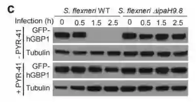 GBP蛋白能介导细胞自主的抗微生物防御机制。在这篇研究中,北京生命科学研究所的邵峰教授课题组发现,一种叫做志贺氏痢疾杆菌(Shigella flexneri)的微生物在感染后,能诱发人类GBP1蛋白的快速降解。进一步的研究发现,一种叫做IpaH9.8的分子在其中起到了关键作用。该分子能直接靶向人GBP1蛋白,在Lys-48位点进行泛素化。事实上,这种分子能靶向多种GBP蛋白,影响到抗微生物的防御机制。这一发现有助于我们更好地理解GBP蛋白介导的免疫力。