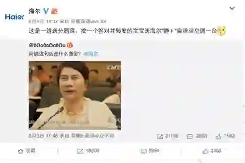 网友将董明珠这段话的视频截图发给了海尔官微,海尔官微很机智的借机营销了一下。海尔官微称:这是一道送分题,抽一个答对并转发的宝宝送海尔“静+”自清洁空调一台。