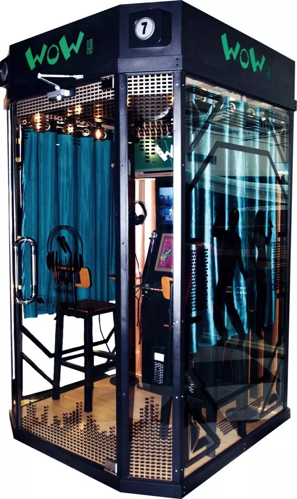 记者特意体验了一下WOW屋,从造型上看与其他迷你KTV没有太大差别,透明的玻璃房内,门以外四周都有窗帘遮挡,基本可以隔绝外界的声音,收费分为单曲收费和15、30、60分钟包时两种,可以直接通过微信支付,完成支付后能够选歌,带上头戴式耳机唱歌并自动录音,重要的一点是,WOW屋能够像美图秀秀一键美颜一样做到“美音”,对用户录制的歌曲进行修饰,最终可以一键分享到朋友圈。
