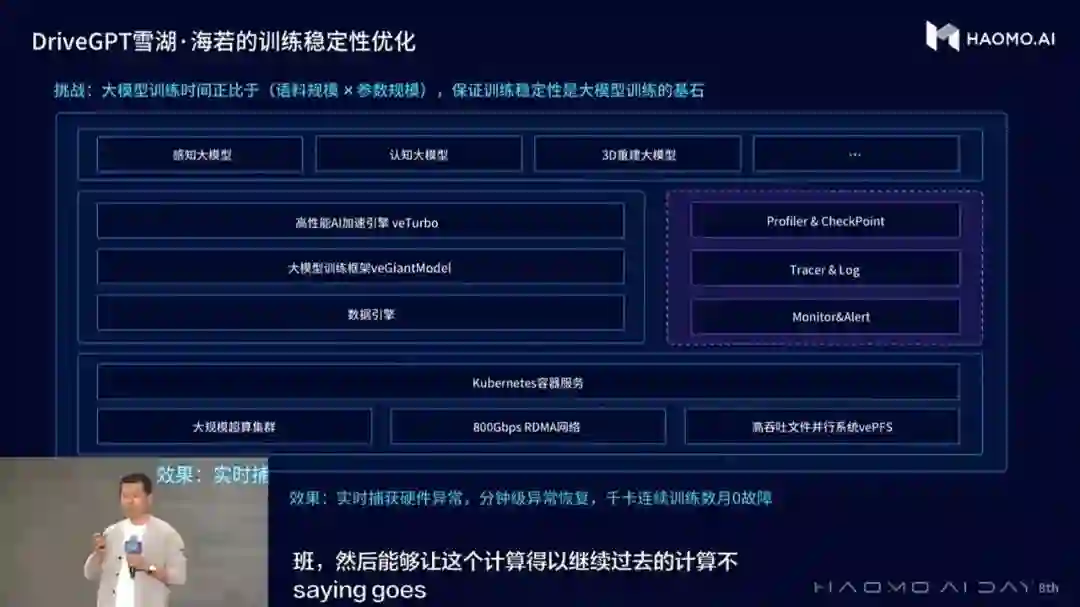 「最终我们实现了异常任务分钟级捕获和恢复能力,可以保证千卡任务连续训练数月没有任何非正常中断,有效地保障了 DriveGPT 大模型训练的稳定性。」顾维灏表示。