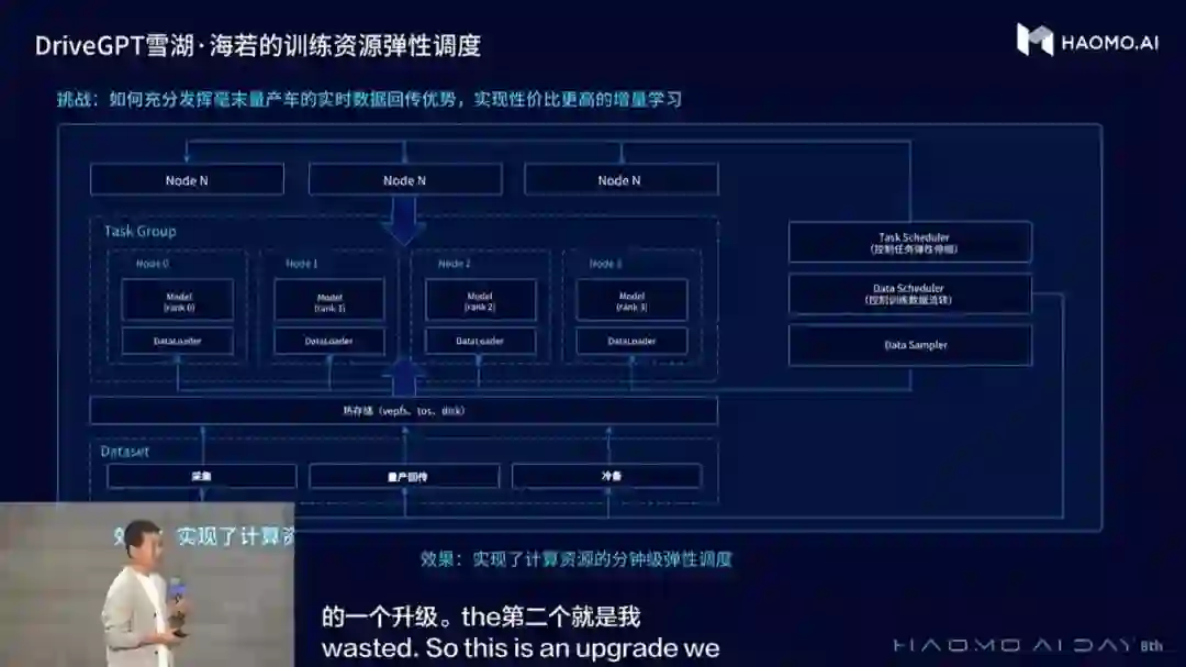 顾维灏介绍:「由于每天回传的数据不同的时段数据量差异巨大,这就要求我们训练平台具备弹性调度能力,自适应数据规模大小。我们将增量学习技术推广到了大模型训,构建了一个大模型持续学习系统,研发了任务级弹性伸缩调度器,分钟级调度资源,集群计算资源利用率达到 95%。」
