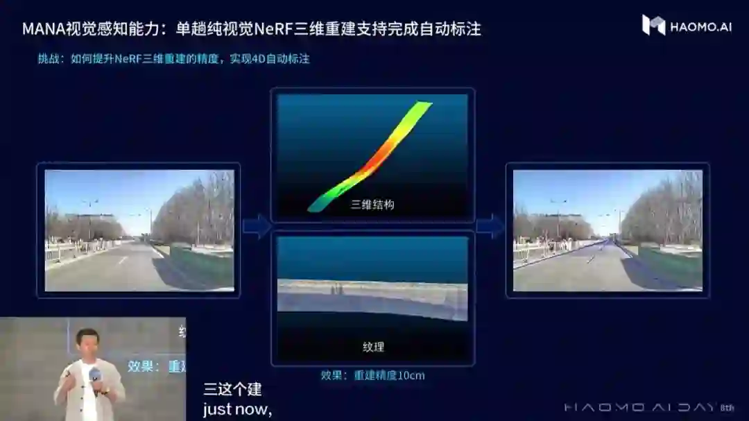 通过视觉自监督大模型技术,做到不依赖激光雷达,将收集的大量量产回传视频转化为可用于 BEV 模型训练、带 3D 标注的真值数据后,毫末智行还在纯视觉 NeRF 三维重建方面取得更多进展。