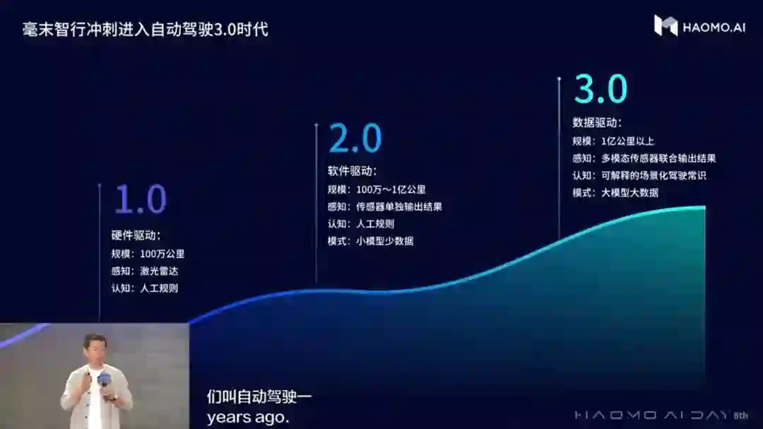 按照毫末的判断,这次 DriveGPT 雪湖・海若大模型的发布,也代表其将加速从软件驱动的 2.0 时代,跨向大模型、大数据、大算力为特点的数据驱动的自动驾驶 3.0 时代。