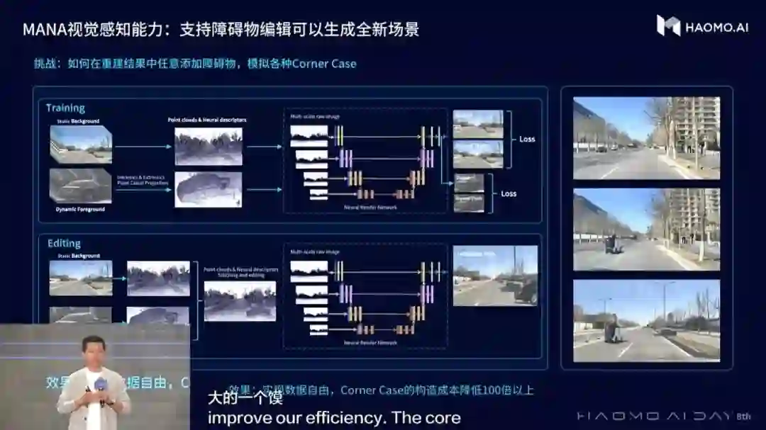 通过 NeRF 进行场景重建后,就可以直接编辑合成真实环境难以收集到的 Corner Case,减去采集成本。其是在原有的全局视角修改、添加光照 / 天气效果的基础上,新增合成虚拟动态物体的能力,可以在原有设定的运动轨迹上,合成各种 Hard Case,模拟城市复杂交通环境,用更低成本测试提升城市 NOH 能力边界,更好提升应对城市复杂交通环境。
