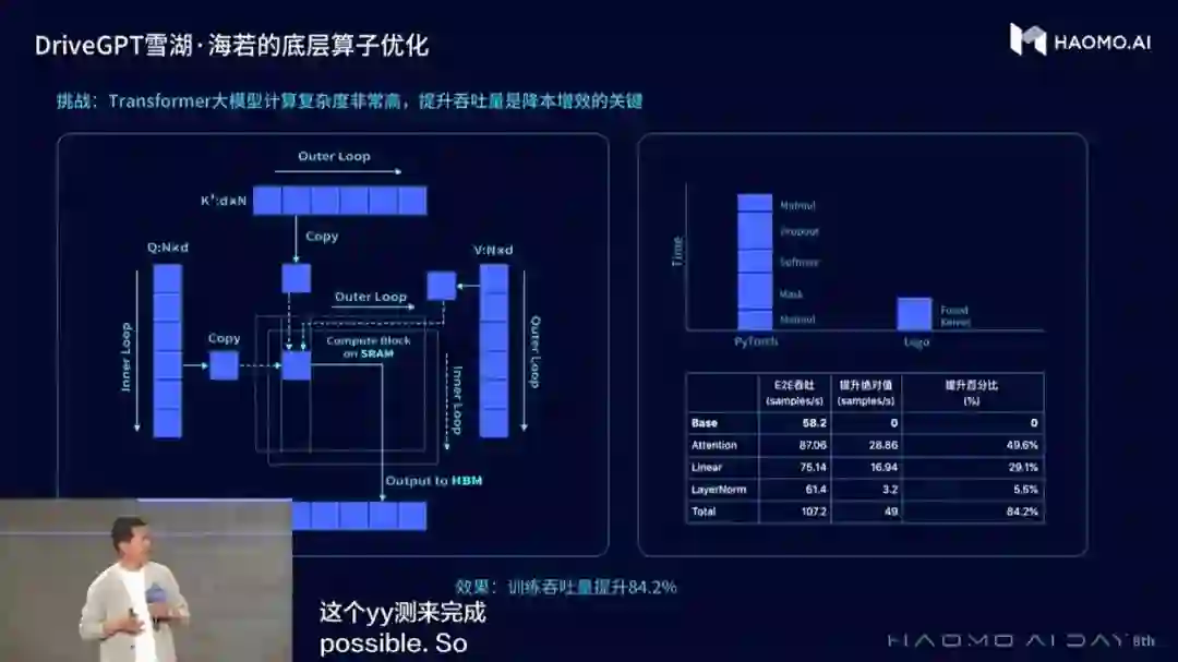 最后在训练效率上,毫末智行还针对 Transformer 大矩阵计算,通过对内外循环的数据拆分,尽量保持数据在 SRAM 中,以提升计算的效率。Transformer 类大模型计算复杂度高,训练难度大。传统训练框架中存在 PyTorch,算子流程很长等问题,毫末智行通过引入火山引擎提供的 Lego 算子库实现算子融合,将端到端吞吐提升 84%。