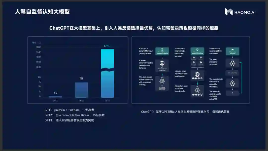 DriveGPT 雪湖・海若的训练,是根据历史去生成未来所有可能的场景,并根据概率推理出未来一段时间的多个可能。这一过程利用了大概万多的接管数据来进行 RLHF 训练,反馈数据当中就会隐藏了不同场景下错误的自动驾驶开法与正确的人类开法。看到这里,是不是有很熟悉的味道,那就是 DriveGPT 采用了和 ChatGPT 训练同源的算法。