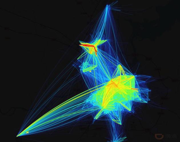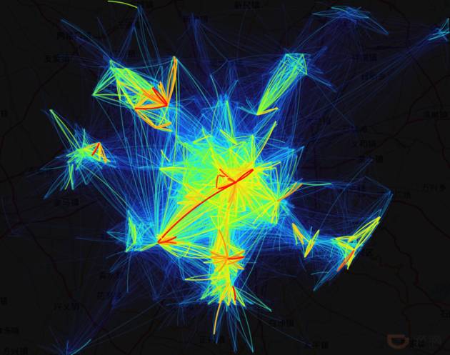 此外,基于OD绘制的东莞出行地图也展现出,以多个活跃区为中心的城市走廊形成了一系列的簇,如巨网一般将整座城市覆盖。