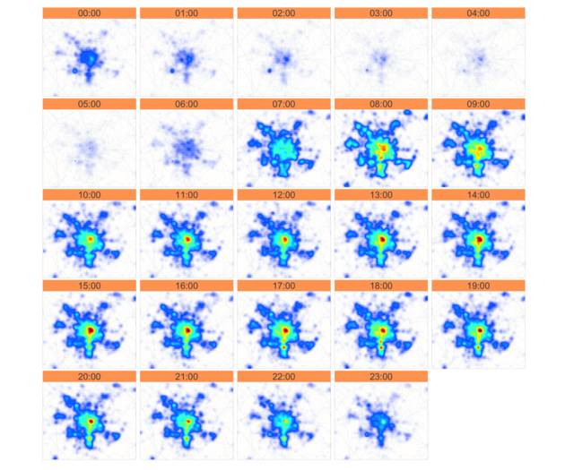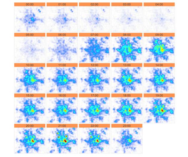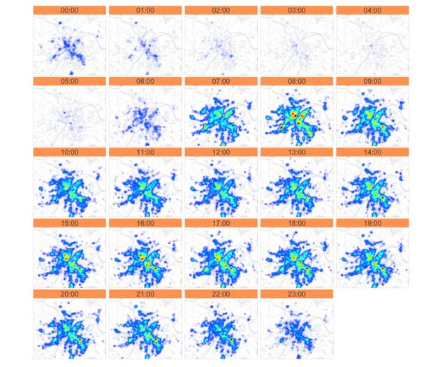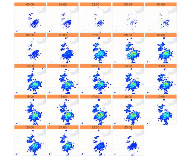 凌晨3~4点,除了机场和三里屯外,城市里绝大部分的人都还在睡梦中;清晨6点开始,人们开始上班、出行,城市逐渐苏醒;进入到白天后,国贸地区保持活跃,在城市的东部持续闪耀;而傍晚则呈现出多个中心,尤其在21点,国贸、中关村、西二旗、望京、亦庄等地的热度会短暂上升;而23点后,城市中心又回归到三里屯。