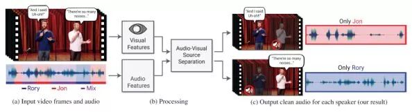 图3:(a) 输入的视频帧与音频;(b) 处理思路:分别提取视频、音频特征,并执行音视频源分离;(c): 为每个说话者输出干净的音频 [1]
