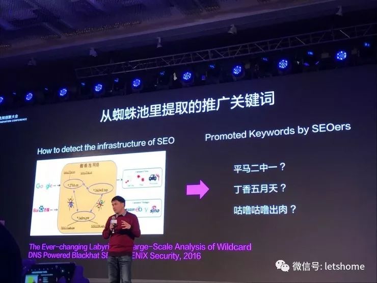 “黑产词”是伴随黑产出现的产品同义词及违法产品本身的关键词的统称。非法商贩和买家通过协定新的词汇表示一种产品,以此躲避监管。例如段海新的研究主要FOCUS在黑产次的检测、黑词和白词的过滤、提取和判断。此项话题是公众非常有感知,但各大会议中很少介入的点。视角和互动性都有创新意义。