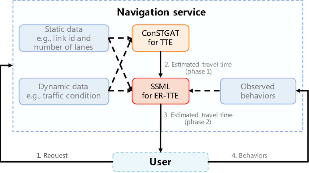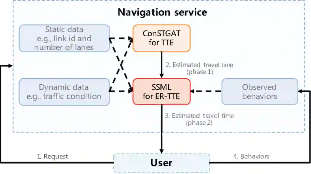 添加了 SSML 模块的导航系统架构如下,可以看到 SSML 模块把不考虑用户已经过路线驾驶行为的ConSTGAT模块以及静态数据,动态数据和获取到的观测行为作为输入,产出预测时长返回给用户。