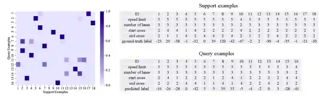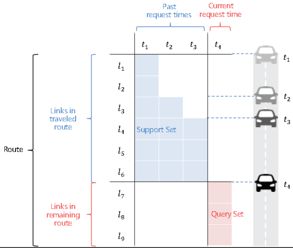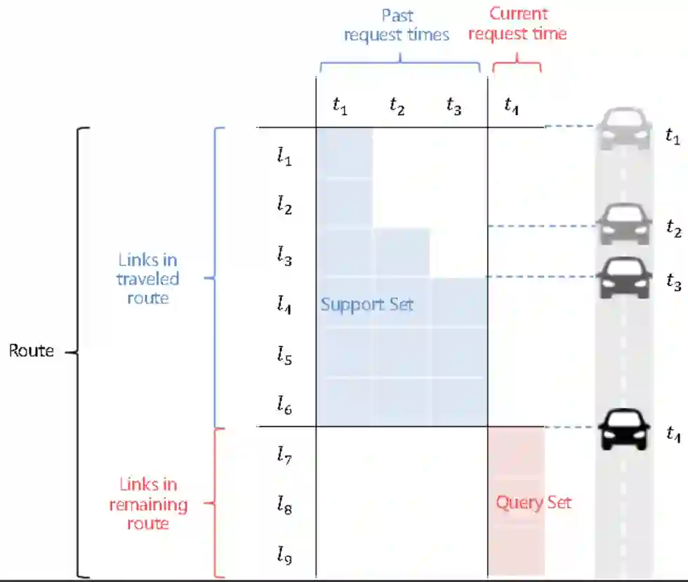 如上图所示,论文将一次请求(即一个时长预测场景)当作一个学习任务。对于每一个学习任务,把收集到的过去多次请求后到目前为止所观测到的已经过多个路段的用户行为(即上图中的蓝色格子)作为支持样本(Support Examples),把从当前时间预估的未经过所有路段的用户行为(即上图中的红色格子)作为查询样本(Query Examples)。