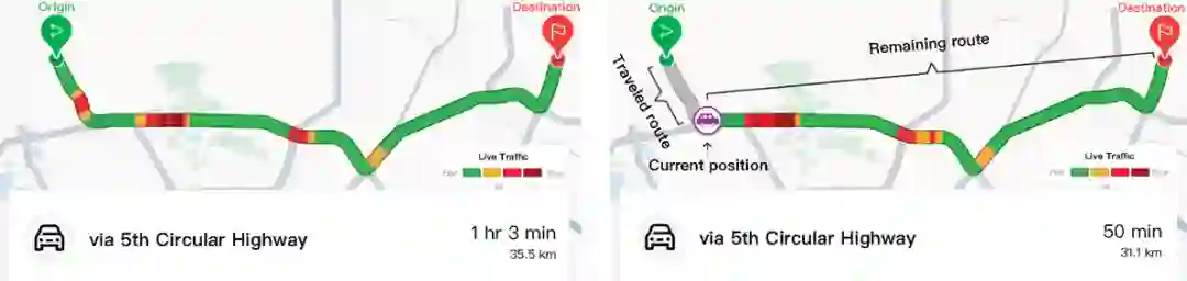 那么我们该如何利用已知的信息,来推测用户个性化的驾驶习惯,从而实现更好与更加智能的预测呢?这里我们可以发现,在用户的驾驶过程中,导航软件并不是一劳永逸的给出一个路线就万事大吉,而是每隔一段时间都会根据当前状态重新计算并更新路线时长,这种在驾驶过程中进行的时长预估被称为在途路线时长预估(En-Route Travel Time Estimation)。