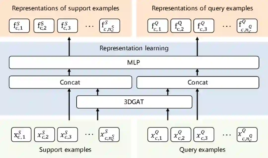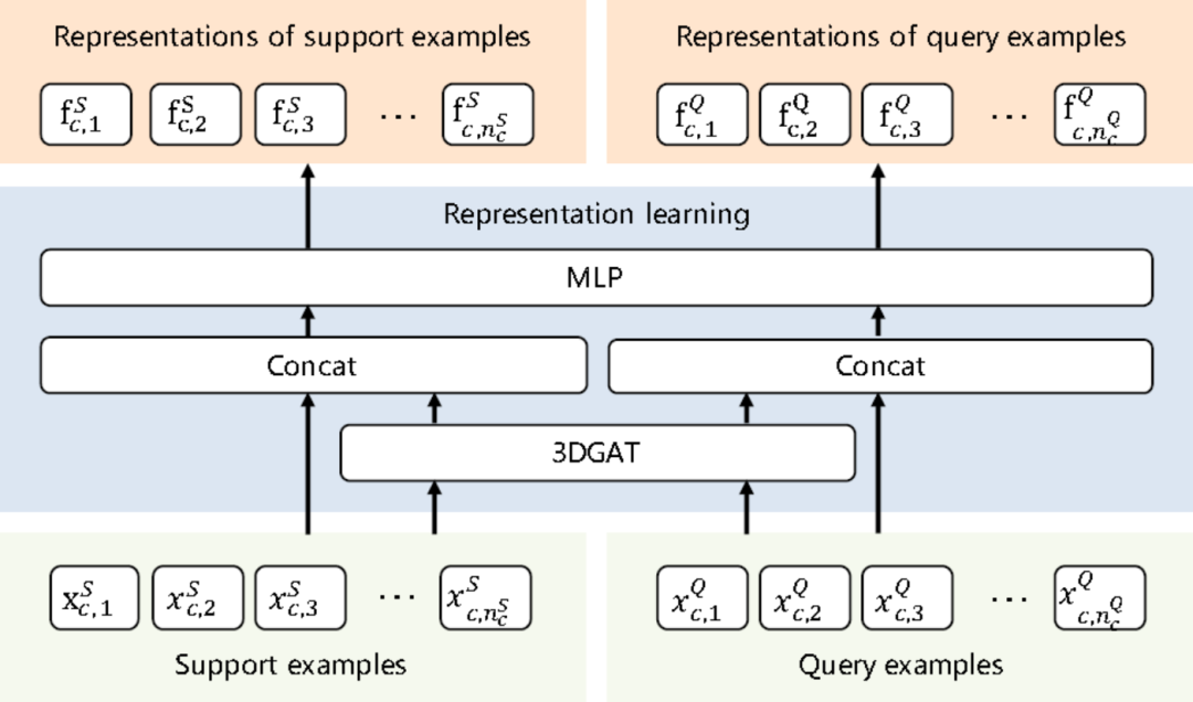 简而言之,论文首先使用 ConSTGAT 中提出3D时空图网络(3DGAT)完成对时空路况的建模,然后与其他输入的样本特征进行拼接,再使用多层感知机来获得样本的表示。这些支持样本和查询样本的表示 和 将作为基于自监督学习的元学习器的输入。
