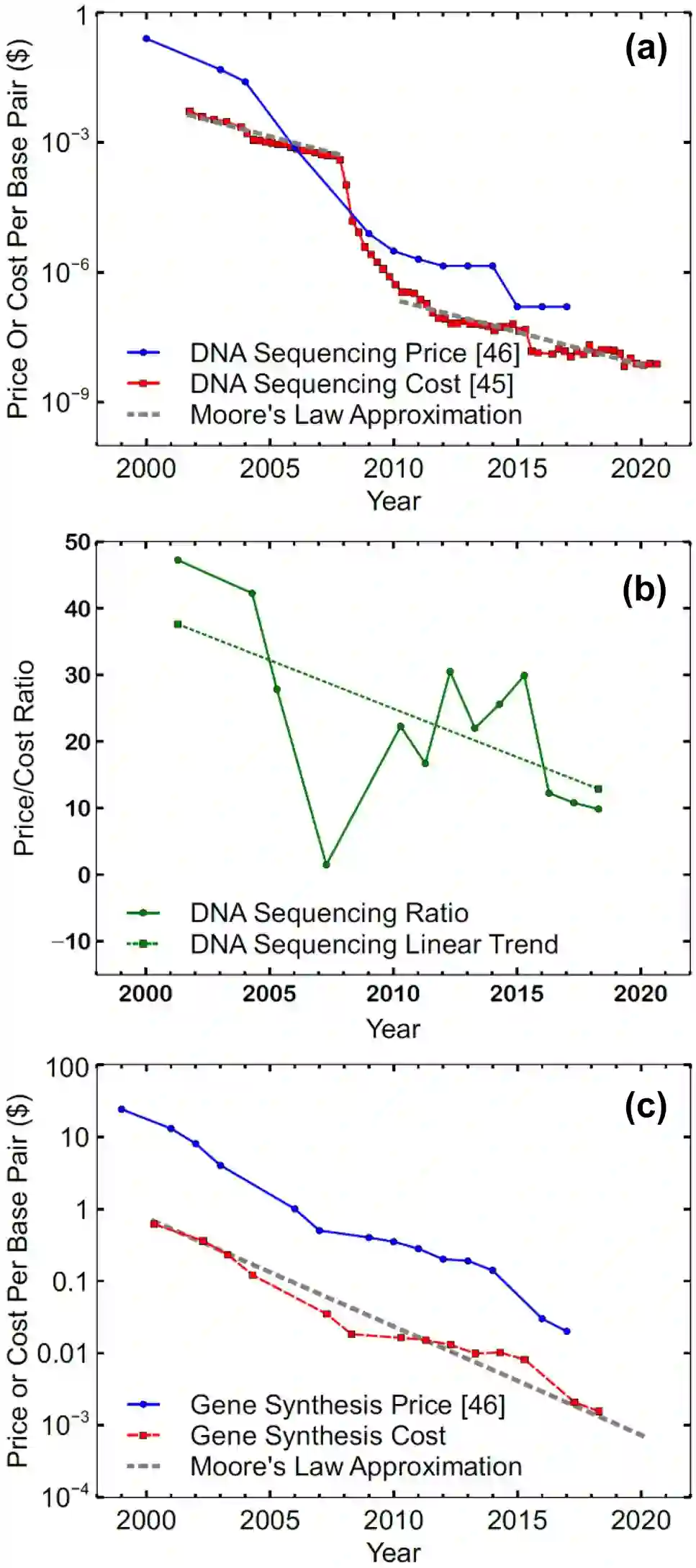图 | 2000-2020 年 DNA 测序的价格和成本(a);DNA测序的价格/成本比(b);DNA 合成的价格和成本 (c) 以及与摩尔定律近似值的比较(来源:Nature)