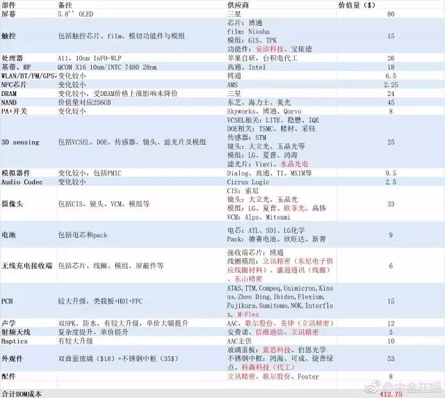 从此次曝光的iPhone X物料清单和成本价格来看,该机最贵的部分来自三星提供的5.8英寸OLED显示屏,成本为80美元。而第二高的成本则是双面玻璃+不锈钢中框,合计的成本价格为53美元。其中,价值18美元的玻璃盖板由蓝思科技、伯恩光学提供,而成本为35美元的不锈钢中框则由鸿海、可成、捷普绿点、科森科技(代工)。