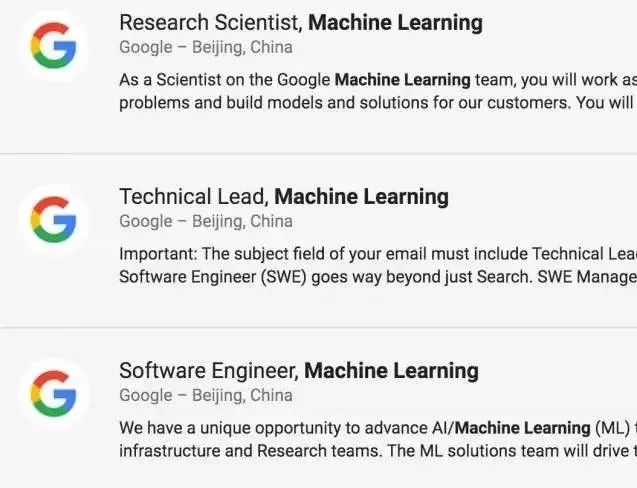 今年下半年,有细心的网友已发现Google正在中国招募AI方向人才。根据招聘信息显示,主要招聘的岗位集中在机器学习领域,包括机器学习研究员、机器学习技术主管、云端机器学习产品经理等。