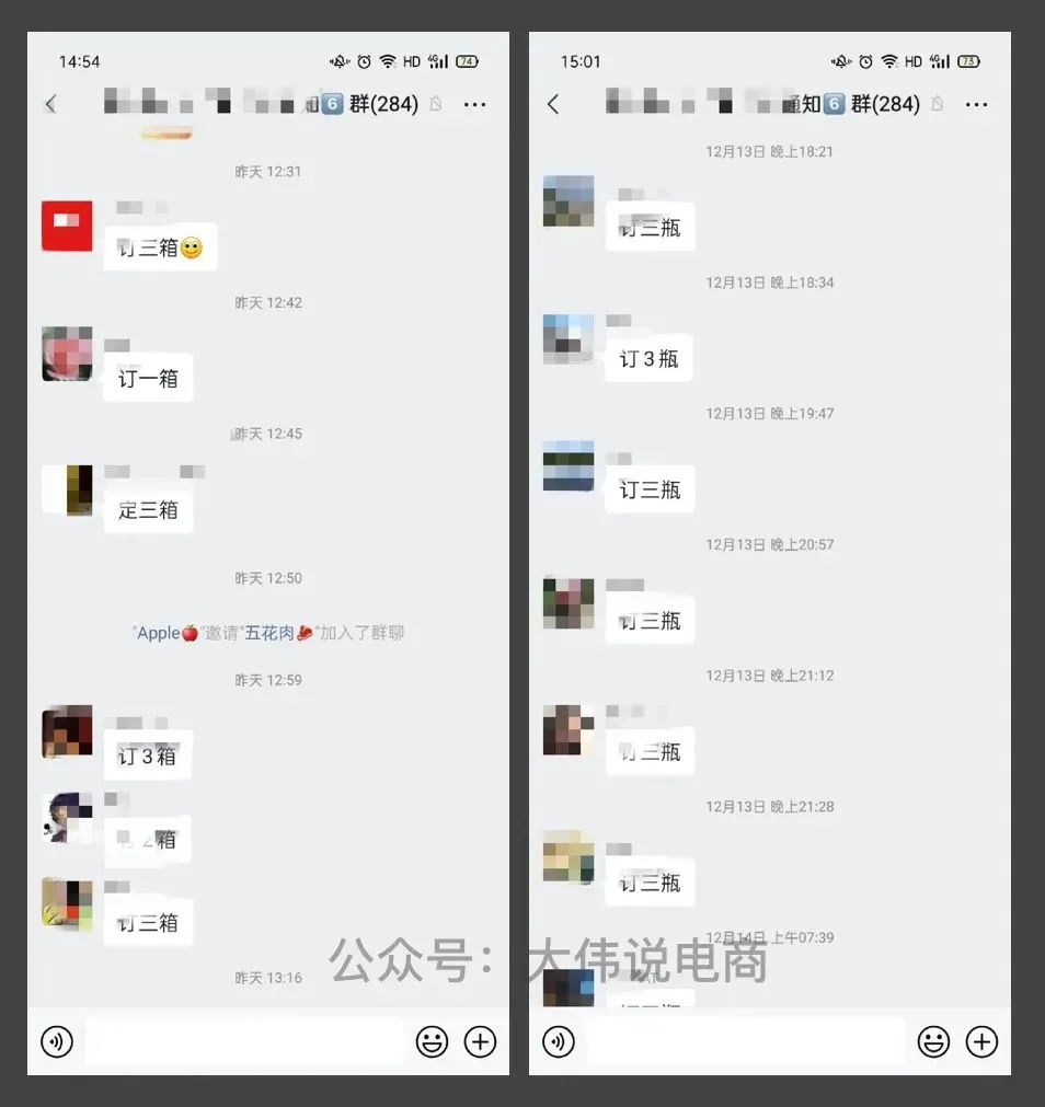 大爷会经常在群里发布类似于微商发的朋友圈,今天又多少用户下单了,还剩有多少余量可抢。