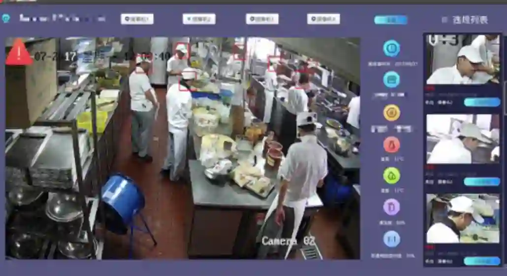 “阳光后厨”通过摄像头、显示屏到手机端和PC端管理、接入展示平台,利用人工智能和大数据技术,让“阳光后厨”可以成为辅助餐厅经营管理的工具,同时帮助管理者实现线上、线下的异常情况报警。