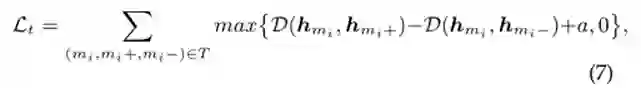 其中(mi, mi+, mi−)是一个三元组,T是一系列以[34]在线采样的三元组。D(,)计算两个消息之间的欧氏距离。max{.}用于获取两个元素中较大的一个。A是一个超参数,它决定了与正样本相比,消息离负样本有多远。