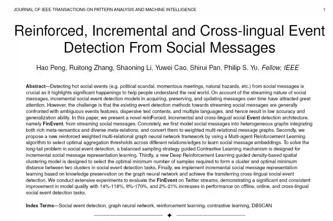 从社会信息中发现热点社会事件(如政治丑闻、重大会议、自然灾害等)是至关重要的,因为它突出了重大事件,有助于人们理解现实世界。由于社会信息的流特性,随着时间的推移,增量的社会事件检测模型在获取、保存和更新消息方面已经引起了广泛的关注。然而,现有的面向流社会信息的事件检测方法通常面临着事件特征模糊、文本内容分散、语言多,准确率和泛化能力较低。在本文中,我们提出了一种新的增强的(强化的)、增量的和跨语言的社会事件检测体系结构,即来自流媒体社会信息的FinEvent。具体来说,我们首先将社会消息建模为融合丰富元语义和多种元关系的异构图,并将其转换为加权多关系消息图。其次,我们提出了一种新的强化加权多关系图神经网络框 架,通过使用多智能体强化学习算法来选择跨不同关系/边的最优聚合阈值,以学习社会消息嵌入。为了解决社会事件检测中的长尾问题,设计了一种平衡采样策略指导的对比学习机制,用于增量社会消息表示学习。第三,设计了一种新的基于深度强化学习的空间聚类模型,用于在社会事件检测任务中选择形成一个聚类所需的最佳最小样本数和两个聚类之间的最佳最小距离。最后,在图神经网络上实现了基于知识保存的增量社会信息表示学习,实现了跨语言的社会事件传递检测。我们进行了大量的实验来评估推特流上的FinEvent,结果表明,在离线、在线和跨语言社会事件检测任务中,FinEvent的模型质量有了显著和持续的提高,分别提高了14%-118%、8%-170%和2%-21%。