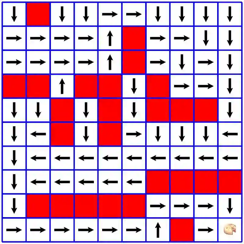 我们的策略将规定在给定环境状态下智能体将做什么。我们可以看到在这策略是给定一个格子,我们的智能体将朝某个方向移动。