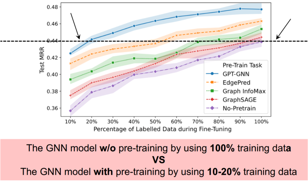 我们还评估了在不同百分比的标记数据下,GPT-GNN 是否依然能取得提升。我们可以看到,使用 GPT 预训练时,仅使用 20% 标签数据的模型性能就会比使用 100% 数据进行直接监督学习的模型性能更高。这显示了预训练的有效性,尤其是在标签稀缺时。