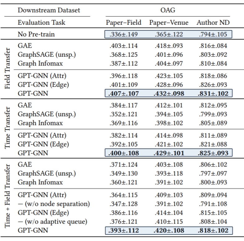 总体而言,我们提出的 GPT-GNN 在不同的实验设定下显著提高下游任务的性能,平均能达到 9.1% 的性能提升,且优于其他图预训练的方法。