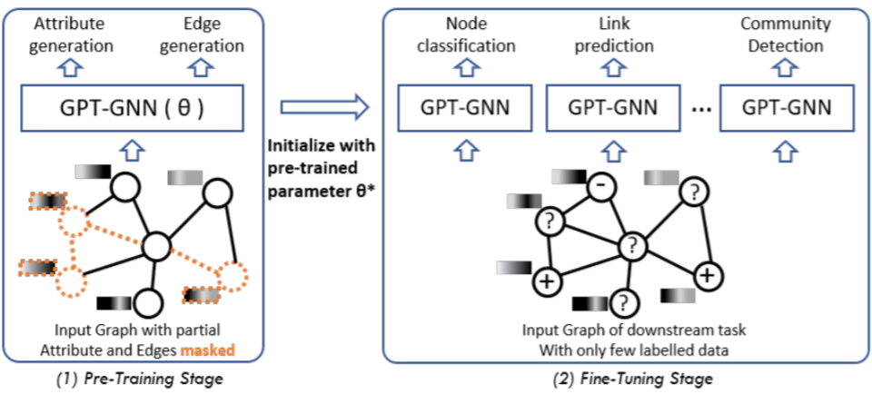 受到这些工作的启发,我们思考能否将预训练的想法运用到图数据分析中。本工作就致力于预训练图神经网络,以期 GNN 能够学习到图数据的结构和特征信息,从而能帮助标注数据较少的下游任务。