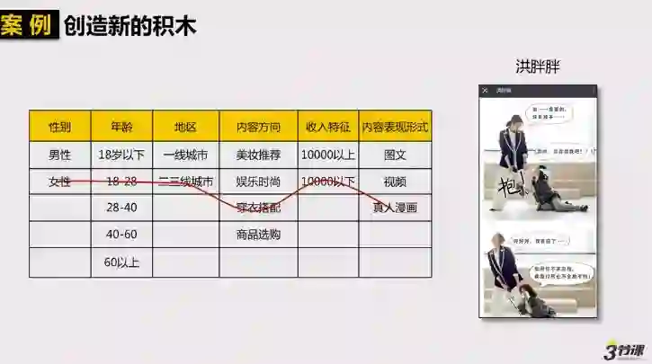 我们再来看课程中的另一个案例,“洪胖胖”这个账号,在内容表现形式上就走了真人漫画的路径,使得它成功在一些穿衣搭配账号里脱引而出。通过这个账号就可以看到,“积木模型”并不是固定不变的,只要你发现新的形式,都可以将其填入在积木框对应的条例,去勾画一条拟合自己品牌的路径。