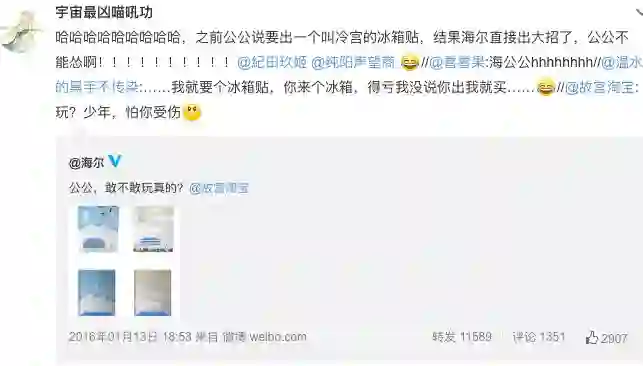 我们以海尔的官微为例,因为故宫淘宝出了款“冷宫”冰箱贴。有用户@了一堆冰箱品牌,建议出一个外观是宫殿的迷你冰箱,其中只有海尔官方微博收到消息后转发并给出答复“容我考虑一下”。