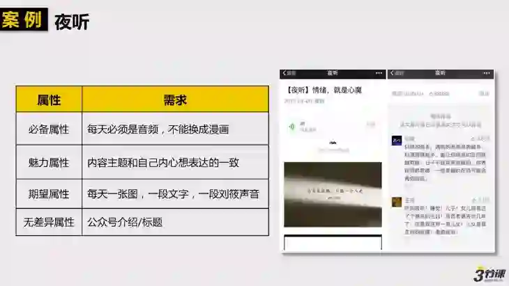 再举一个例子——“夜听”,如下图所示,“夜听”这个账号是从16年开始火起来的,而它之所以能走红就是依赖于独特的音频,成功把自己与其他公众号区分开来,将自己的四大属性都较好的与用户需求做了匹配。