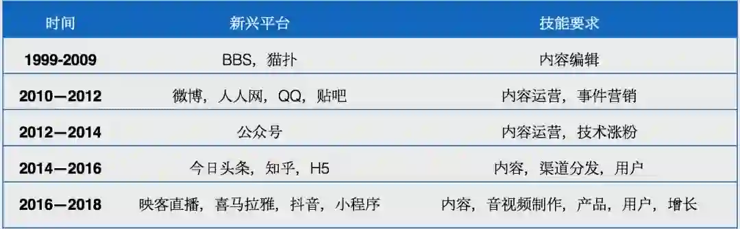 新媒体运营从1999年的BBS时代发展到现在,需要的技能点越加越多。
