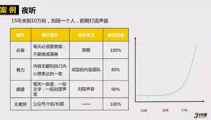 所以,我们可以观察到“夜听”这个账号的前中后期分别先满足了必备属性,将自己的声音打磨好,包括与音乐的结合;到了中期,有了成型团队后,就可以将内容主题打磨的更精细,因此后期粉丝就可以飞速增长。