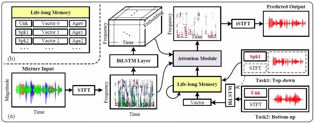 听觉注意性选择示意图。(a)模型总体框架图;(b)用于存储说话人声纹特征的长时记忆单元结构图。