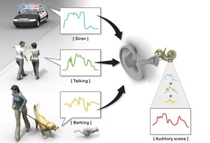 回想一下刚才我们假设的这个场景,当警车鸣笛声出现时,我们可能迅速将注意力集中到这个声音上面,而忽略了其他声音的干扰,比如说行人的说话声和狗叫声。当然,你可以随意测试在多个声源环境下的听觉行为,事实会告诉你,你总是可以自然而完美地听到你想要听到的部分,但是却总是无法同时关注到多个声源。