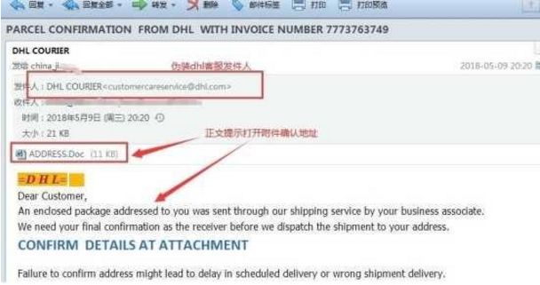 监测发现,不法黑客将发件人伪装成专业从事国际运送业务的知名企业客服人员,并搭配极具说服力的正文内容,诱导收到邮件的业务人员下载查阅附件。一旦用户不慎点开邮件附件文档,就会触发Office公式编辑器漏洞CVE-2017-11882,文档内嵌的恶意代码会自动下载Loki Bot木马程序并运行,造成用户电脑中机密信息泄露。