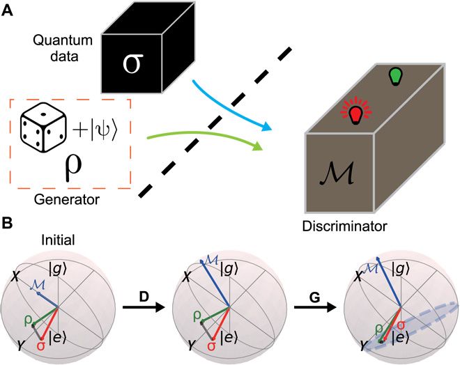 图 1A 展示了 QGAN 方案的示意图。黑盒提供量子真实数据,其由量子系统的密度矩阵σ描述,而内部物理结构和量子过程都不需要知道。