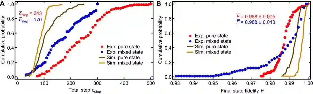 随着训练的进行,假数据和真数据之间的迹距离 d 在每一轮中逐渐减少,并且游戏最终接近纳什均衡。图 4B 展示了量子保真度 F 的累积概率,其中纯和混合量子数据的平均保真度均为 98.8%。