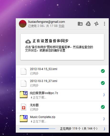 上面说的主要是一些基础性的功能,如果设置正确,在桌面的状态栏中就可以看到选中的文件已经开始上传至 Google 云端硬盘,之后本地相关文件夹就进入同步状态,只要有内容的增添对应云端也会有所变化。