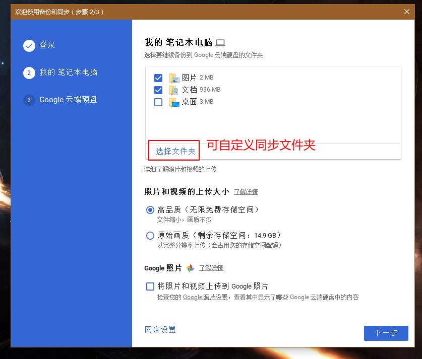 之后是选择需要备份的文件夹,默认是图片、文档、桌面三个文件夹,当然你也可以点击「选择文件夹」来更换同步的文件目录。