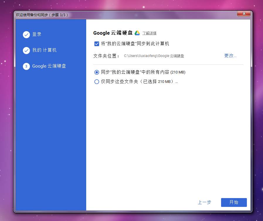 而在最后一个步骤中可以选择是采用双向同步还是仅仅只是将本地文件单向同步至云端(如果之前使用过 Google 云端硬盘需要注意设置),最后点击「开始」等待状态栏中数据上传即可。