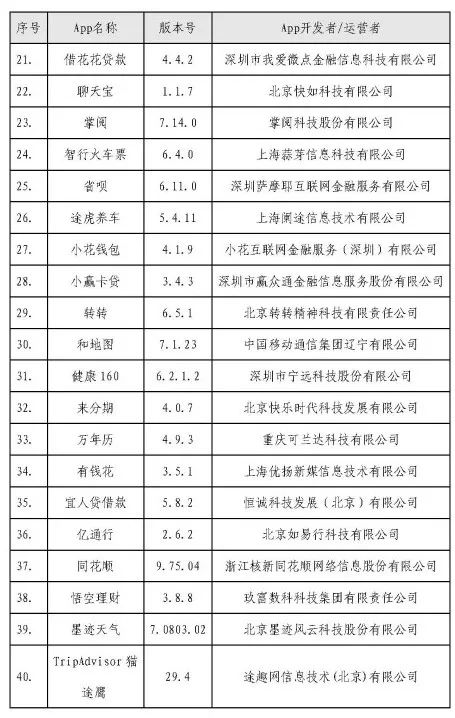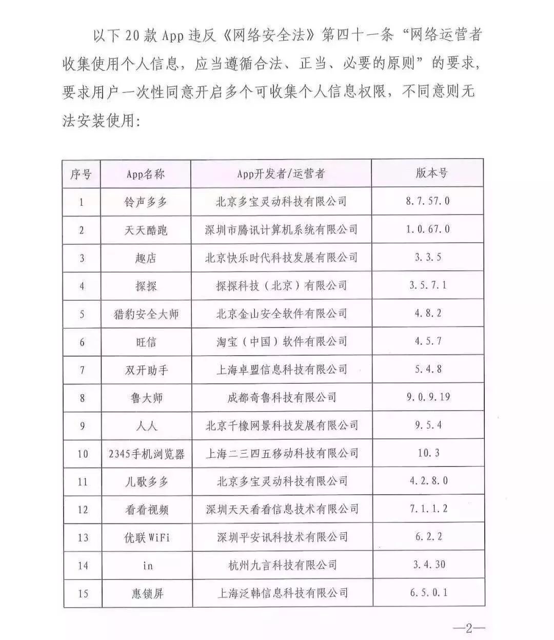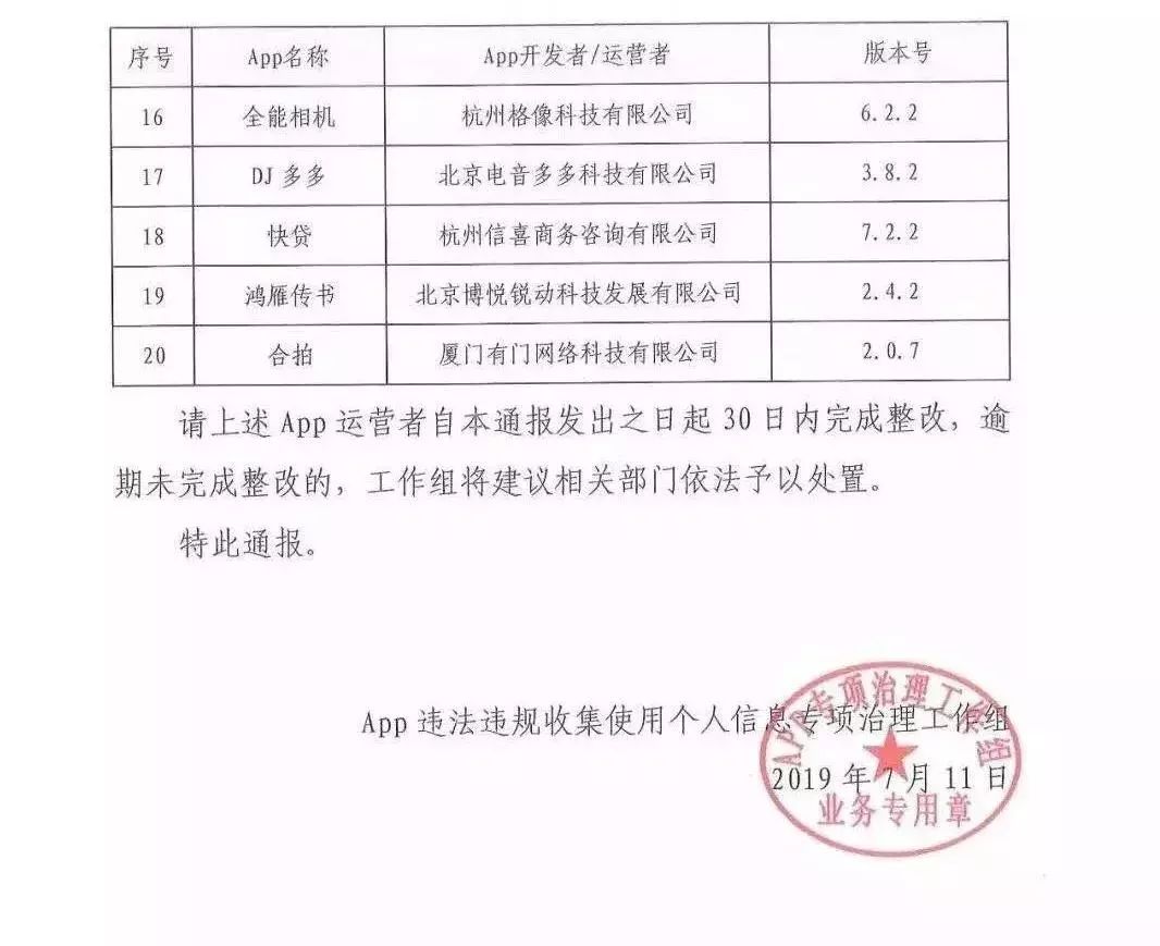 7月16日,由全国信息安全标准化技术委员会、中国消费者协会、中国互联网协会、中国网络空间安全协会成立的App专项治理工作组发布了《关于督促40款存在收集使用个人信息问题的App运营者尽快整改的通知》。