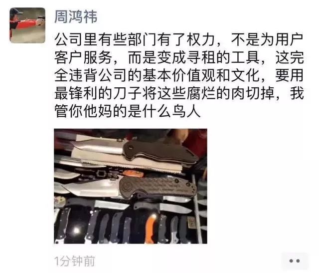 周鸿祎在朋友圈发表了自己的看法:“公司里有些部门有了权力,不是为用户客户服务,而是变成了寻租的工具,这完全违背了公司的基本价值观和文化,要用最锋利的刀子将这些腐烂的肉切掉,我管你是什么鸟人”。